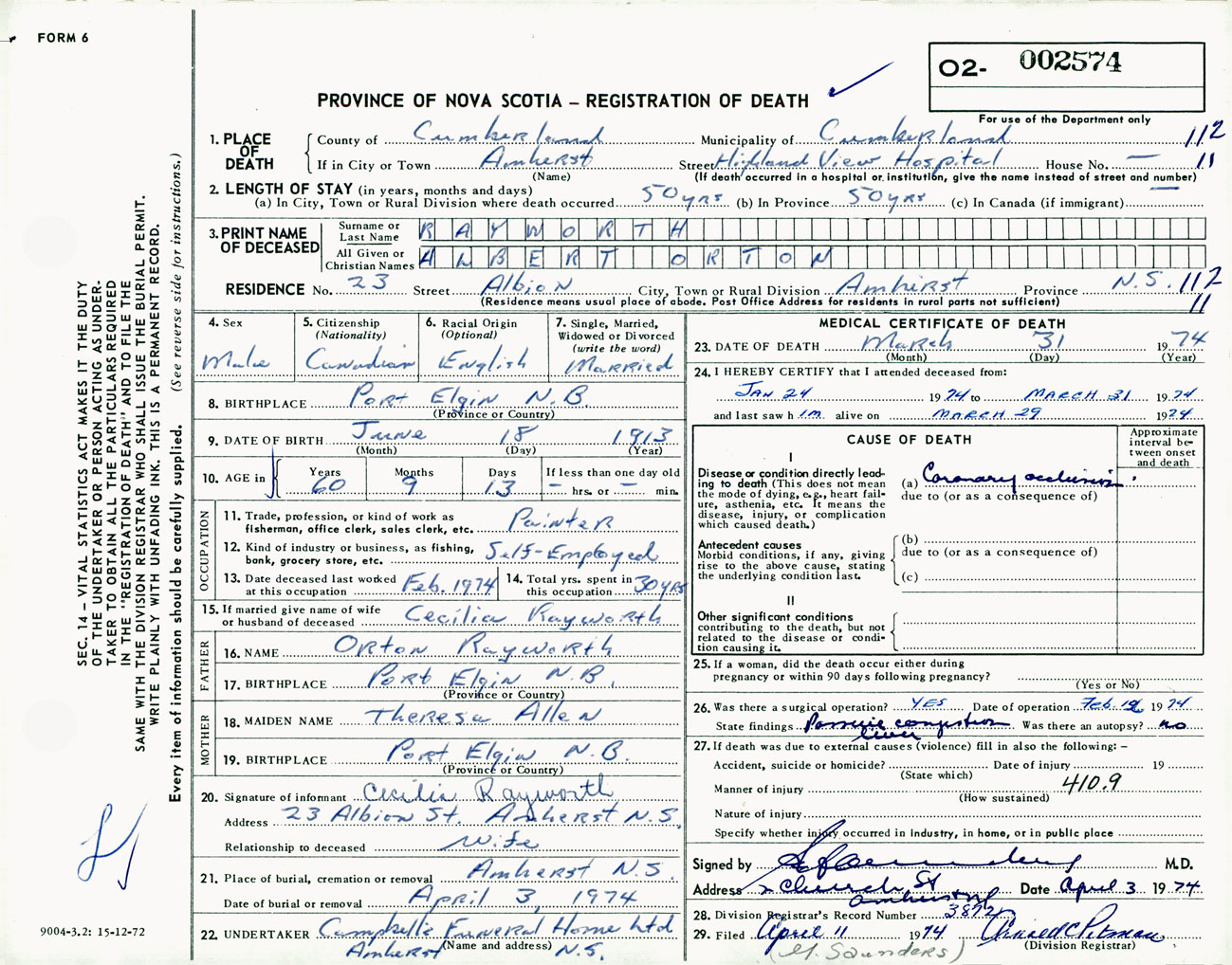 Male Death Registration: Year: 1974 number: 2574