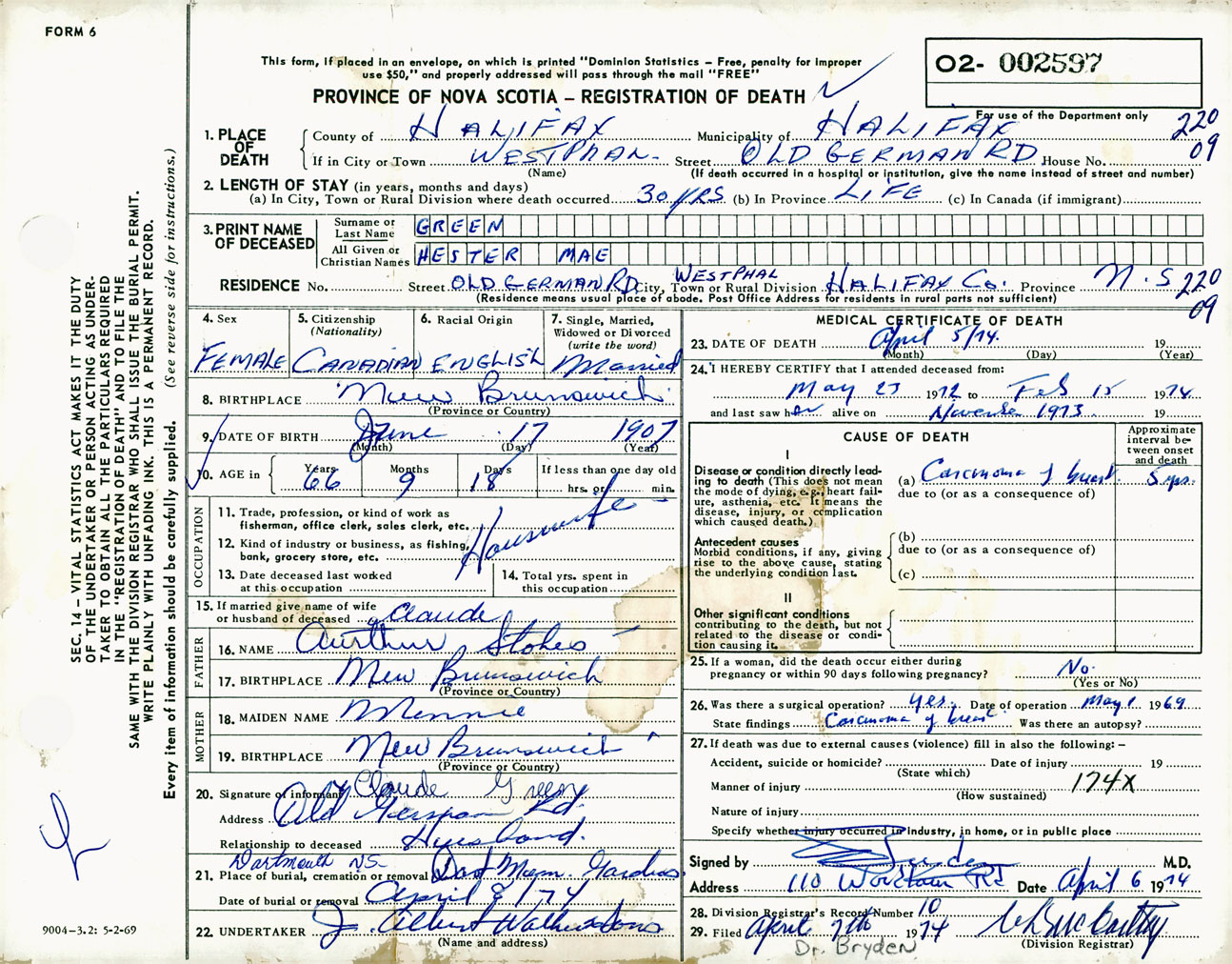 Female Death Registration: Year: 1974 number: 2597