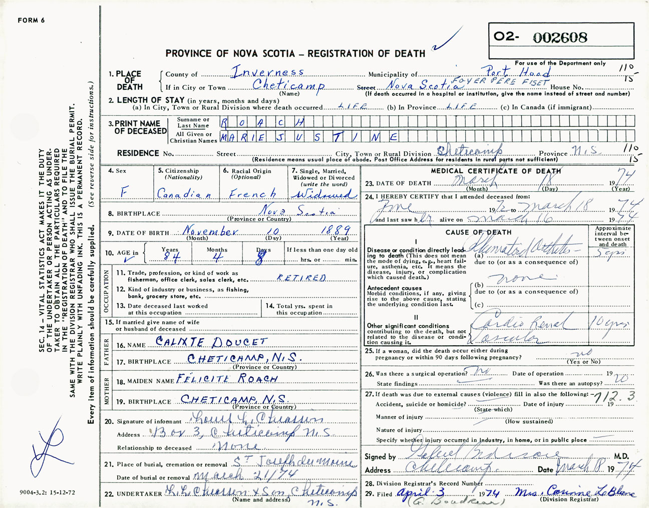 Female Death Registration: Year: 1974 number: 2608