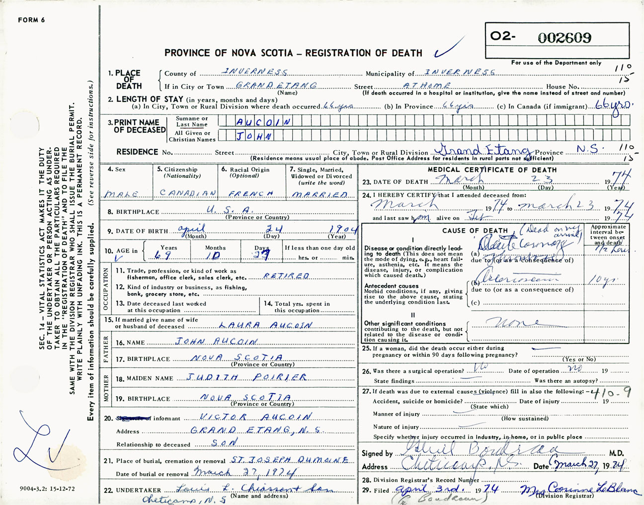 Male Death Registration: Year: 1974 number: 2609