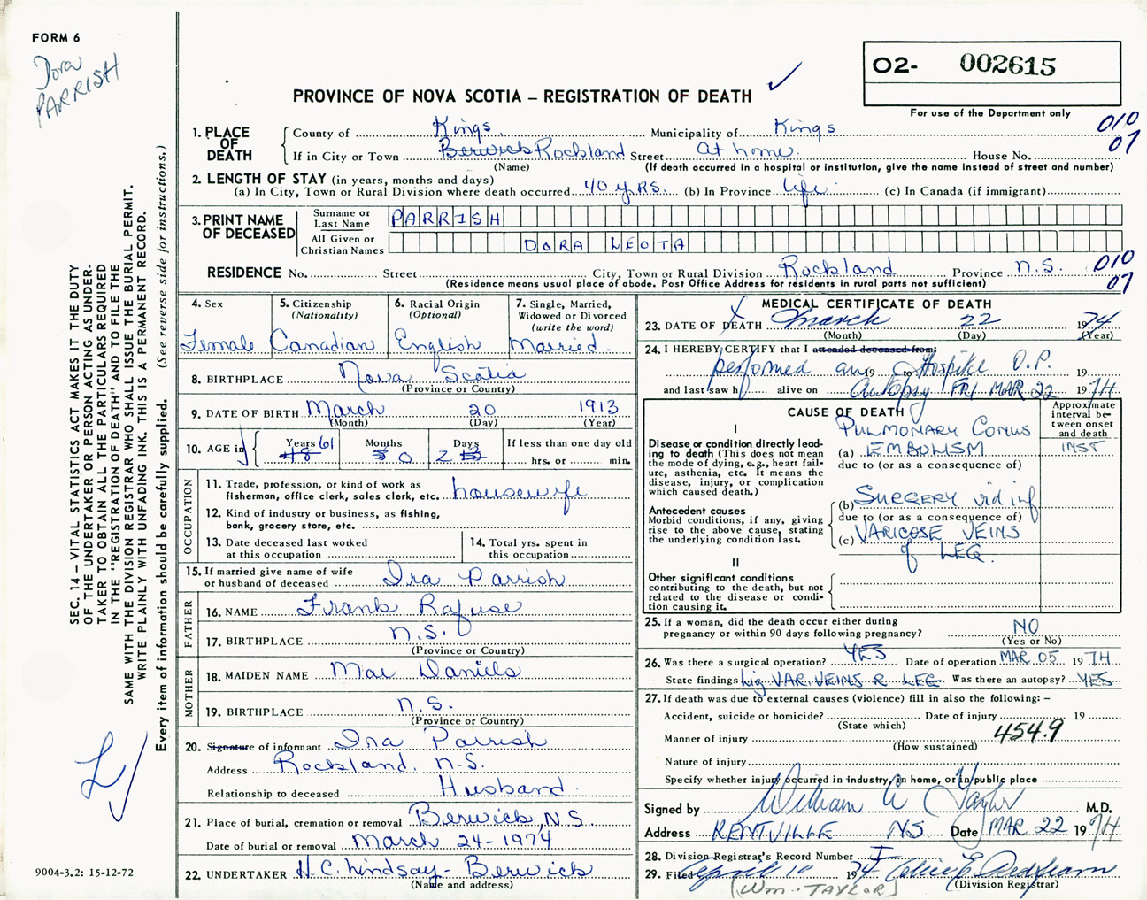 Female Death Registration: Year: 1974 number: 2615