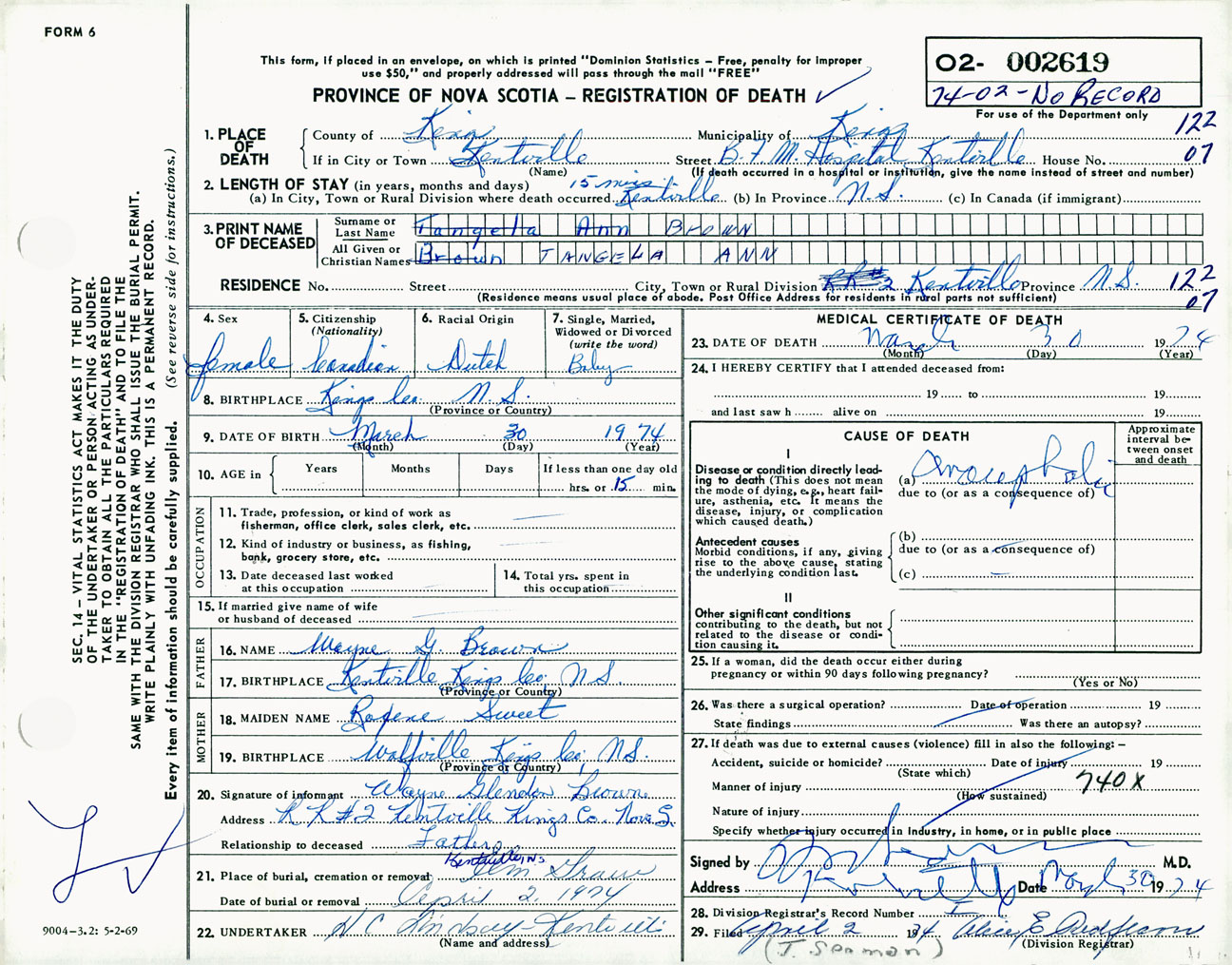 Female Death Registration: Year: 1974 number: 2619