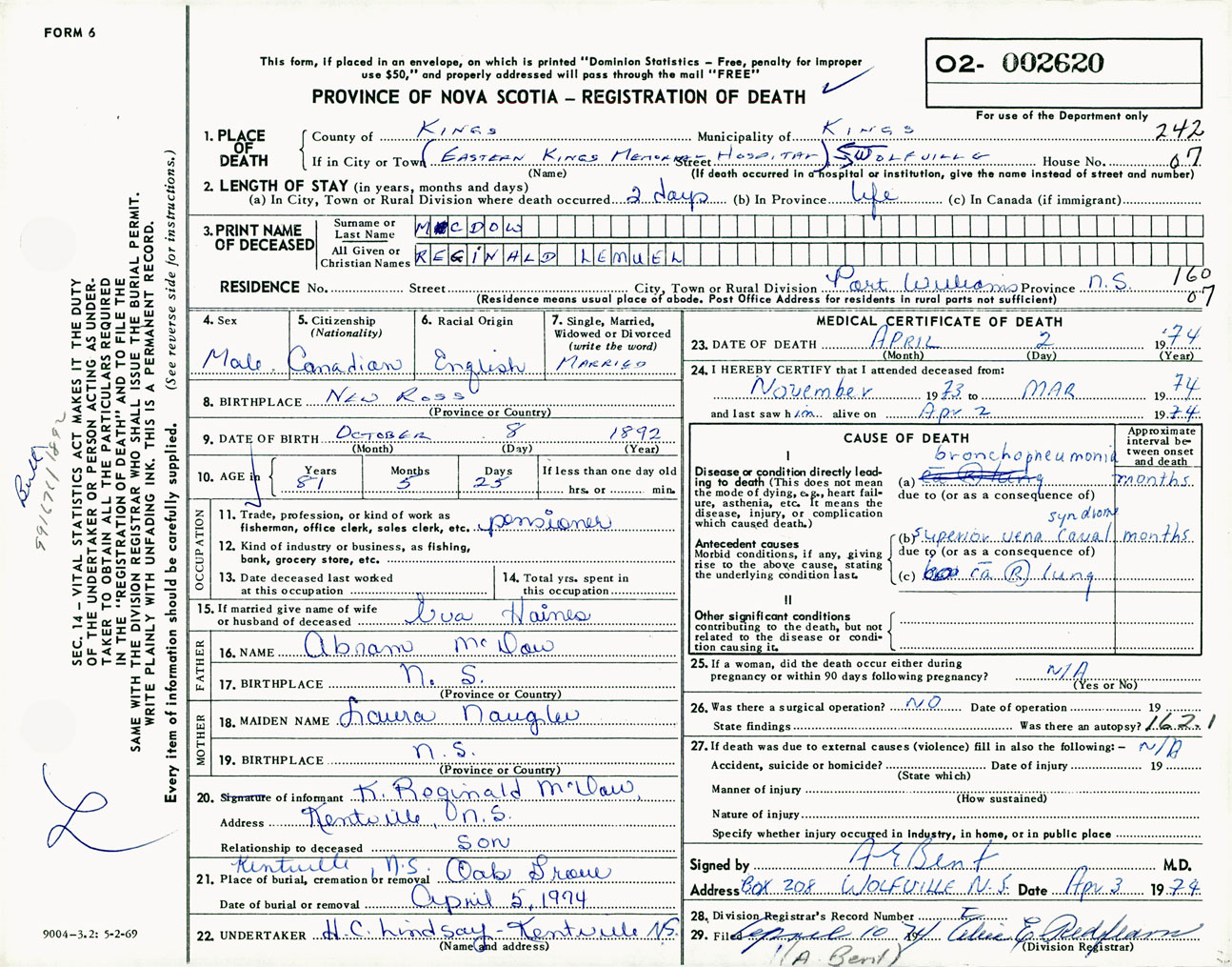 Male Death Registration: Year: 1974 number: 2620