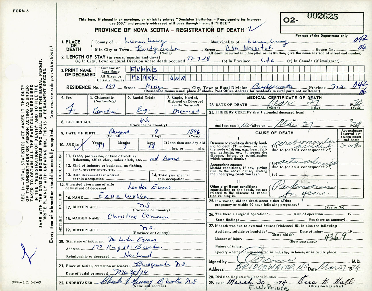 Female Death Registration: Year: 1974 number: 2625