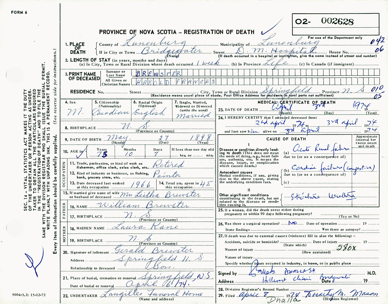 Male Death Registration: Year: 1974 number: 2628