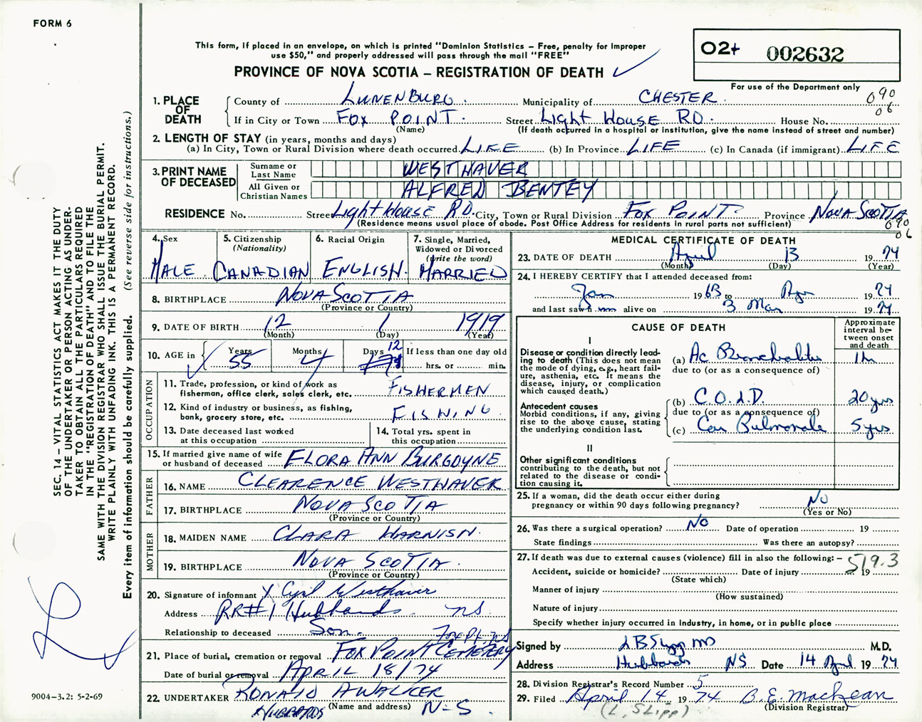 Male Death Registration: Year: 1974 number: 2632