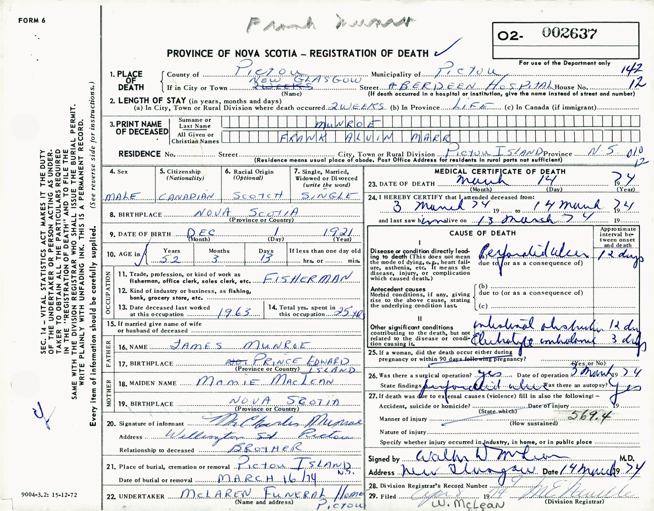 Male Death Registration: Year: 1974 number: 2637
