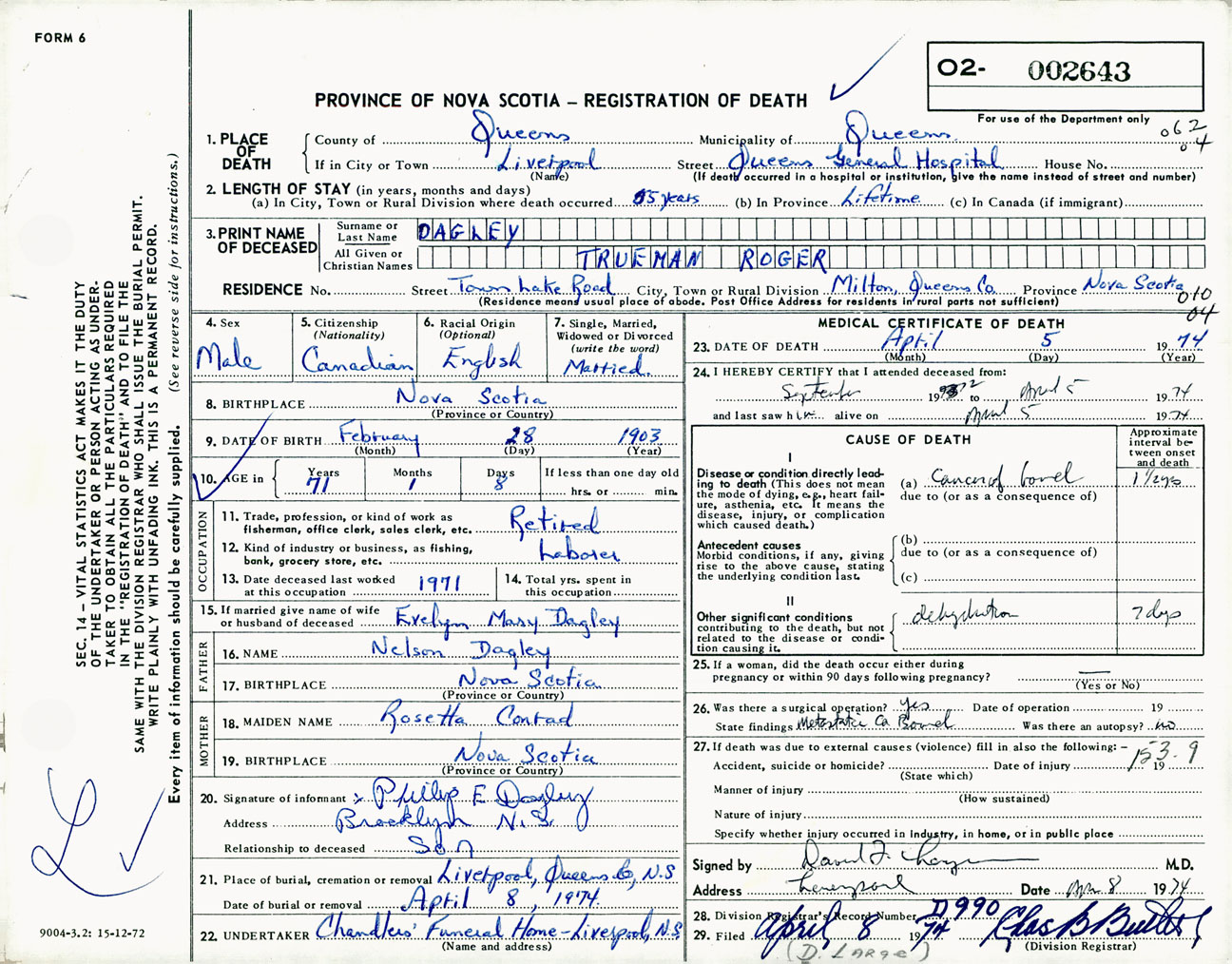 Male Death Registration: Year: 1974 number: 2643