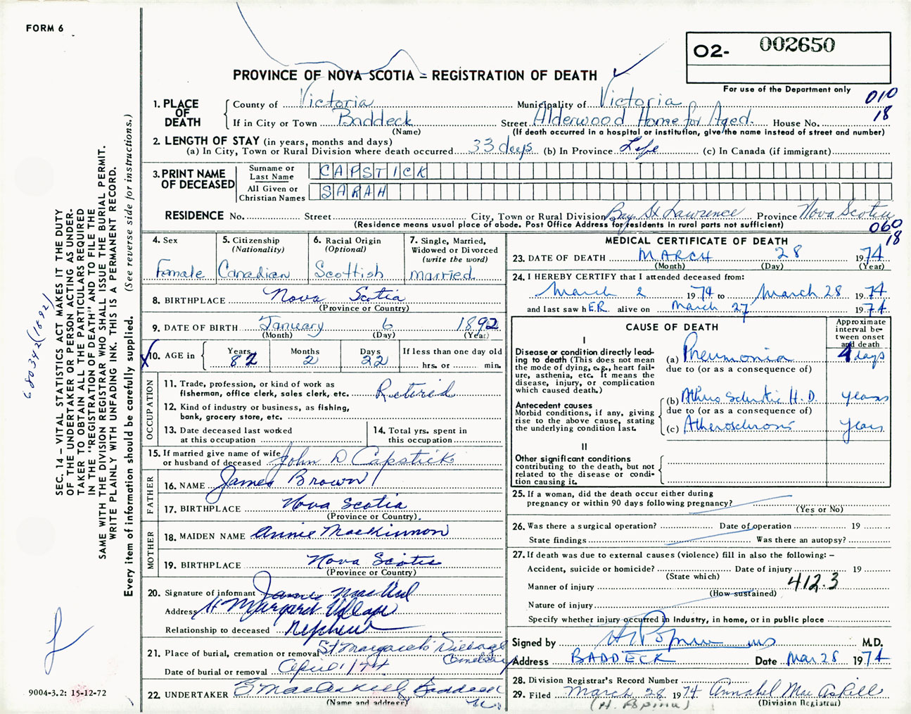 Female Death Registration: Year: 1974 number: 2650