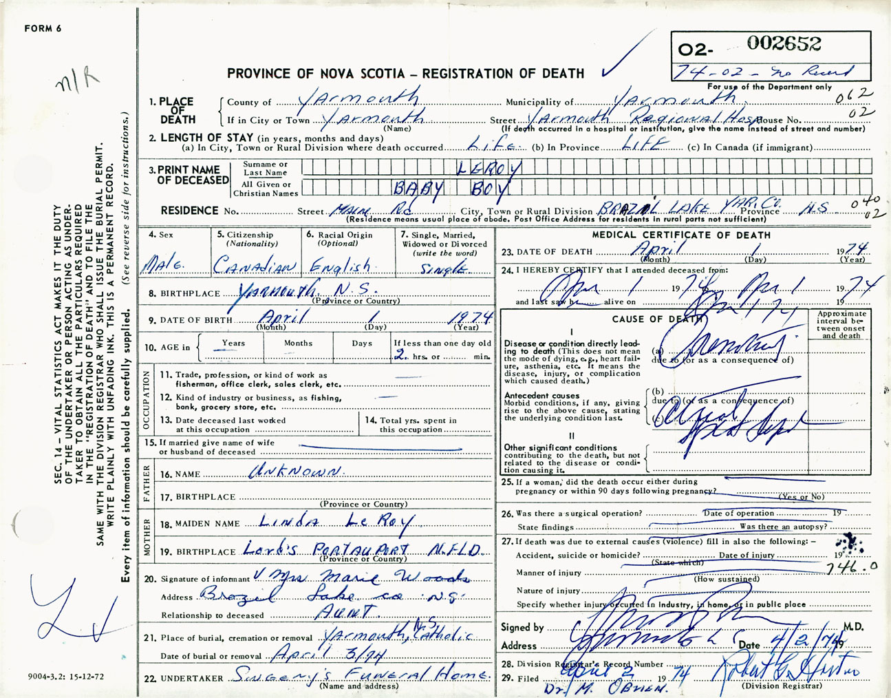 Male Death Registration: Year: 1974 number: 2652