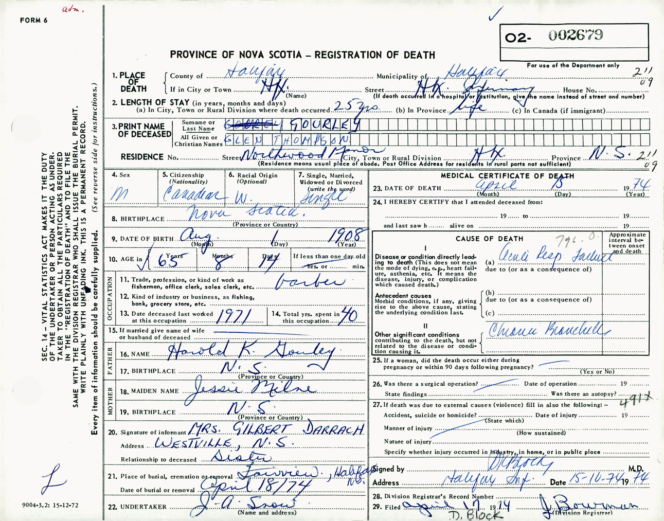 Male Death Registration: Year: 1974 number: 2679