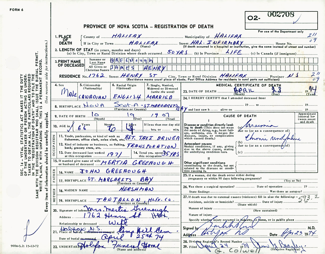 Male Death Registration: Year: 1974 number: 2708
