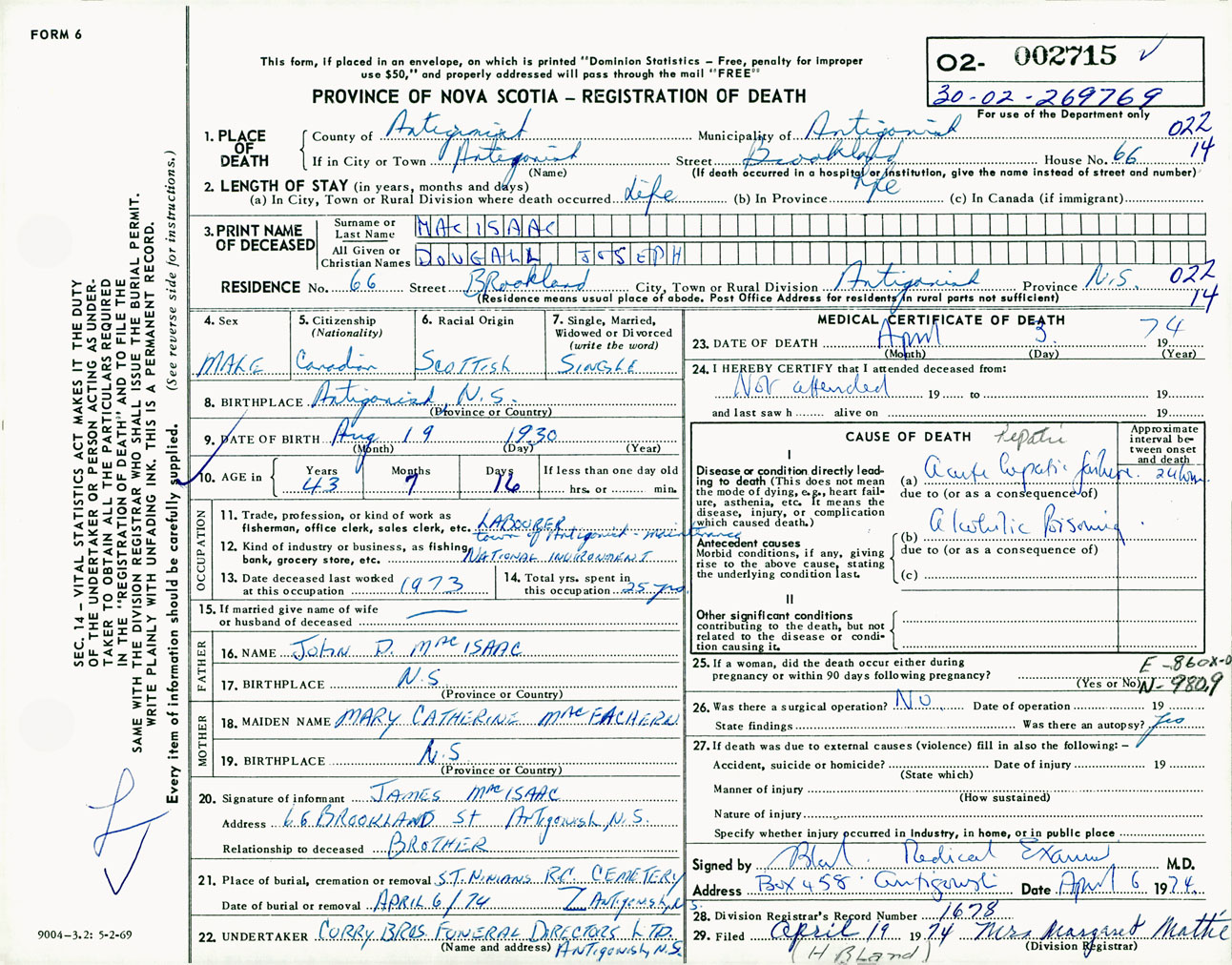 Male Death Registration: Year: 1974 number: 2715