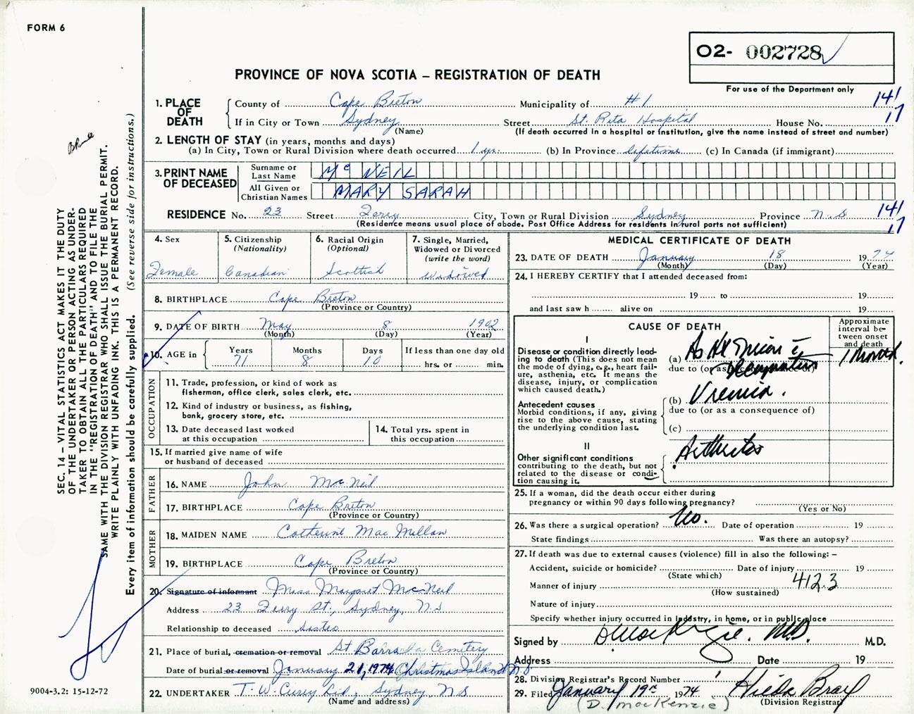Female Death Registration: Year: 1974 number: 2728