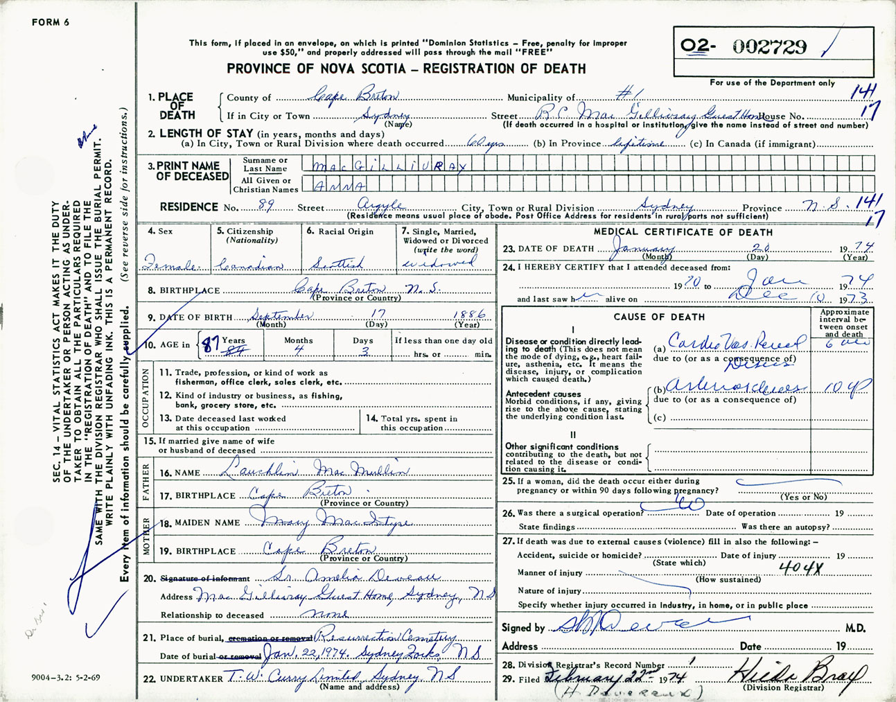 Female Death Registration: Year: 1974 number: 2729