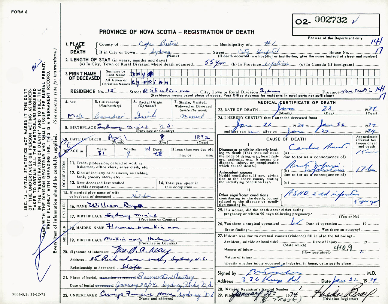 Male Death Registration: Year: 1974 number: 2732