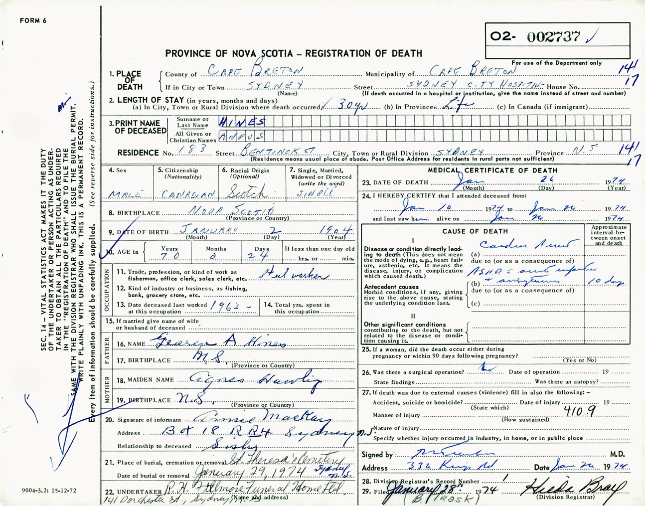 Male Death Registration: Year: 1974 number: 2737