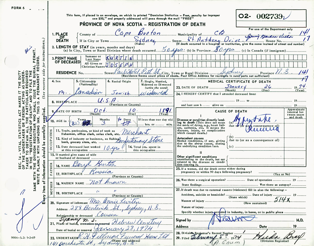Male Death Registration: Year: 1974 number: 2739