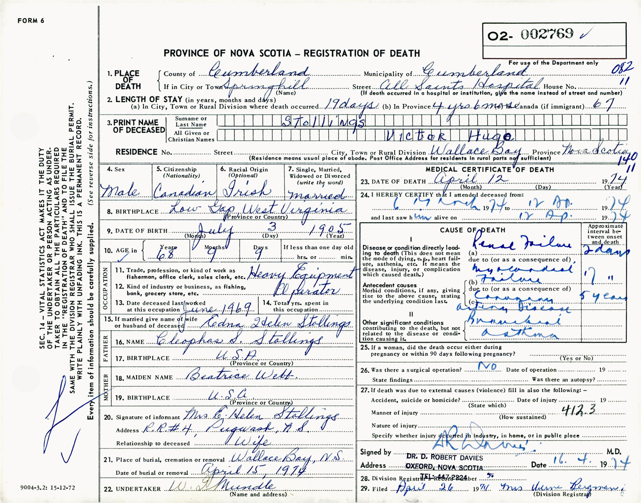 Male Death Registration: Year: 1974 number: 2769