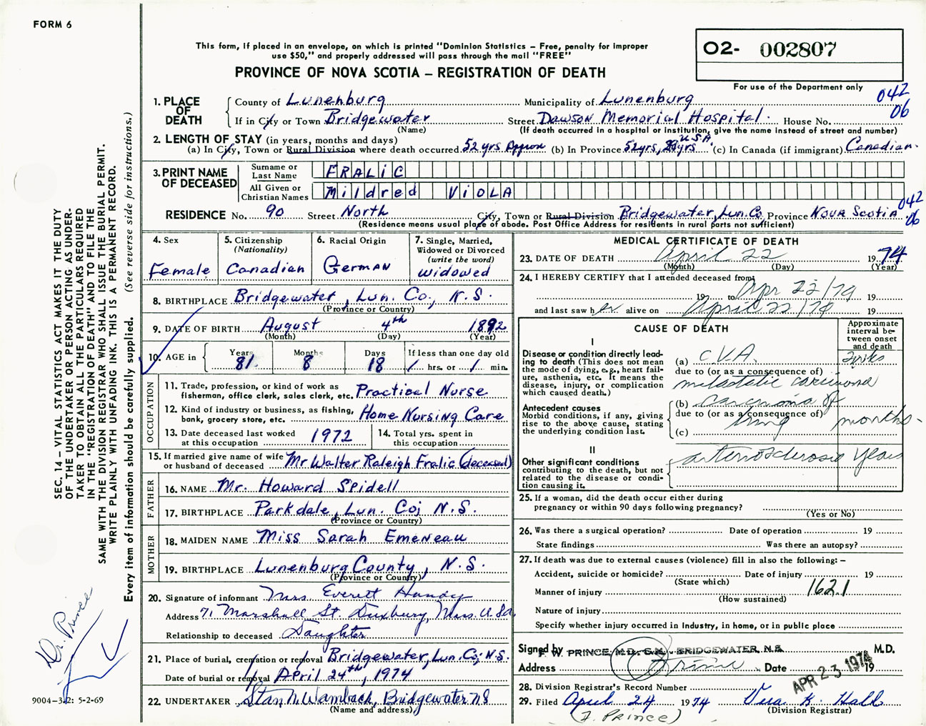 Female Death Registration: Year: 1974 number: 2807