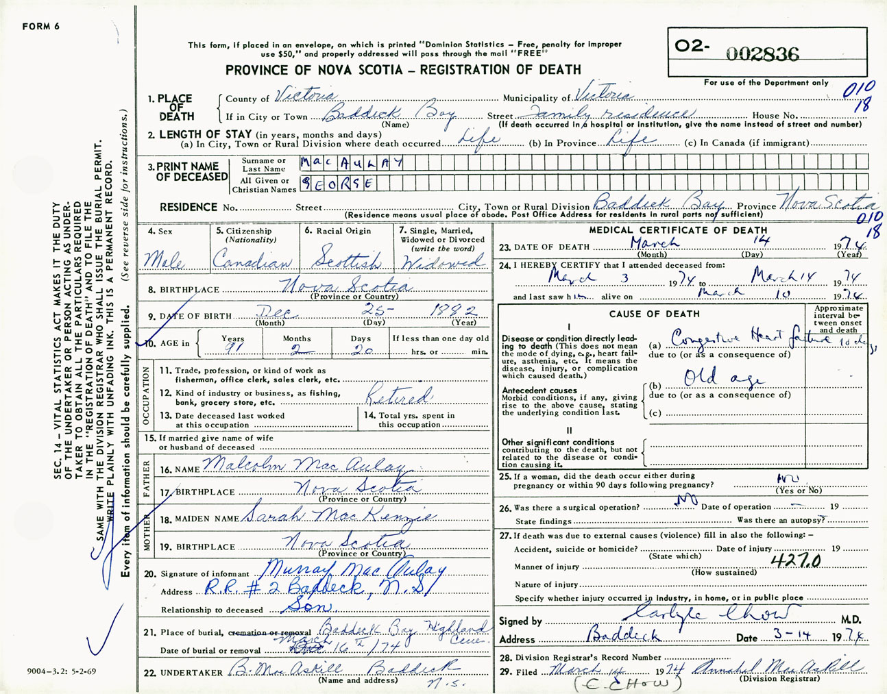 Male Death Registration: Year: 1974 number: 2836