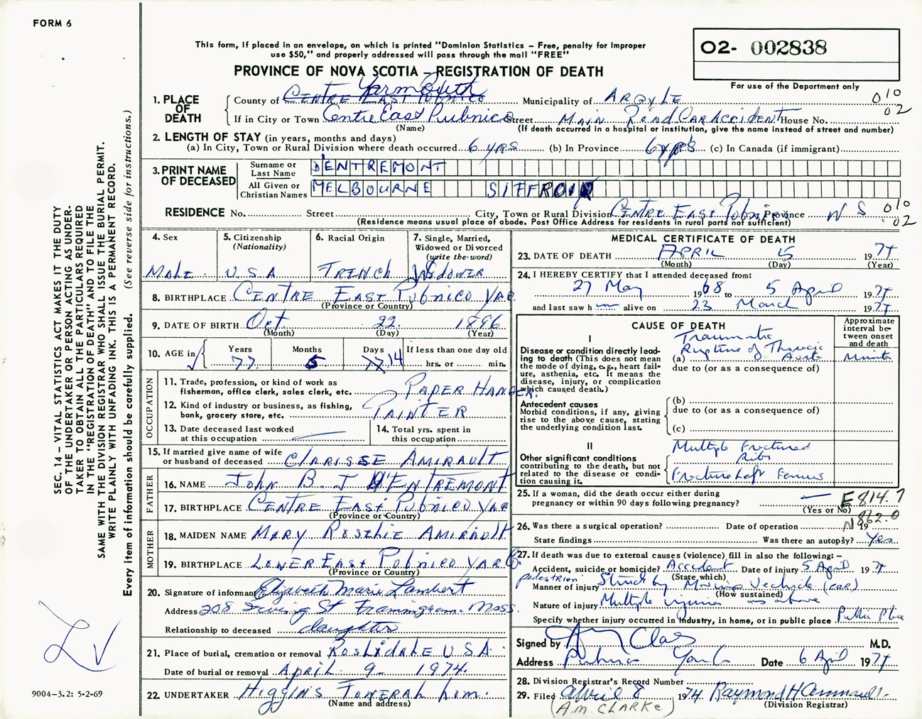 Male Death Registration: Year: 1974 number: 2838