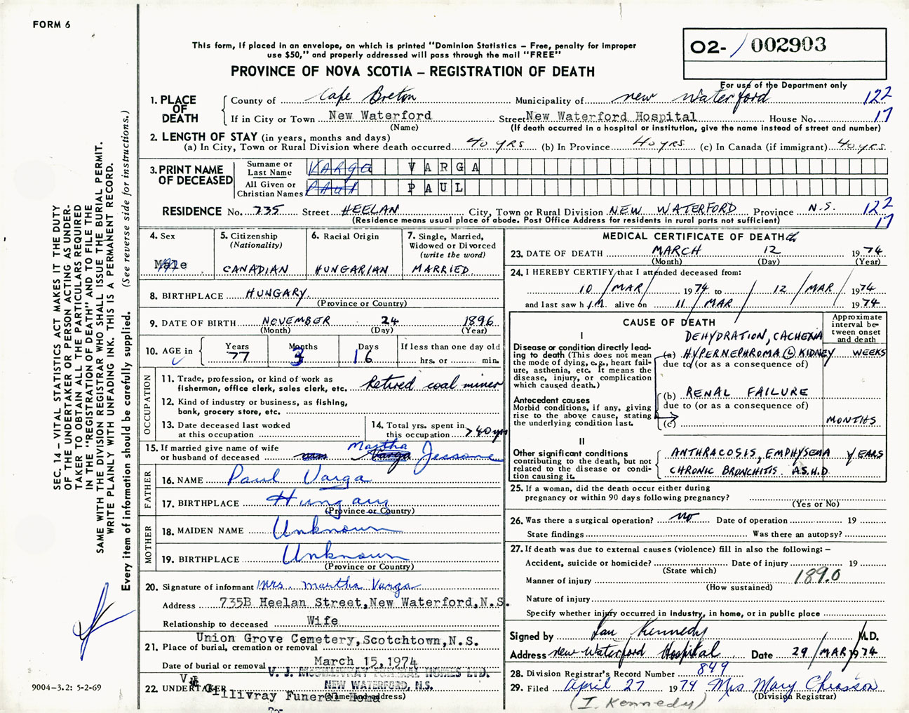Male Death Registration: Year: 1974 number: 2903