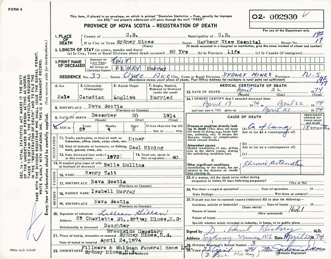 Male Death Registration: Year: 1974 number: 2930