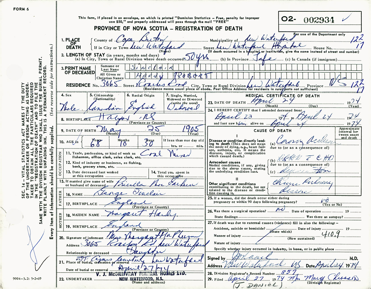 Male Death Registration: Year: 1974 number: 2934