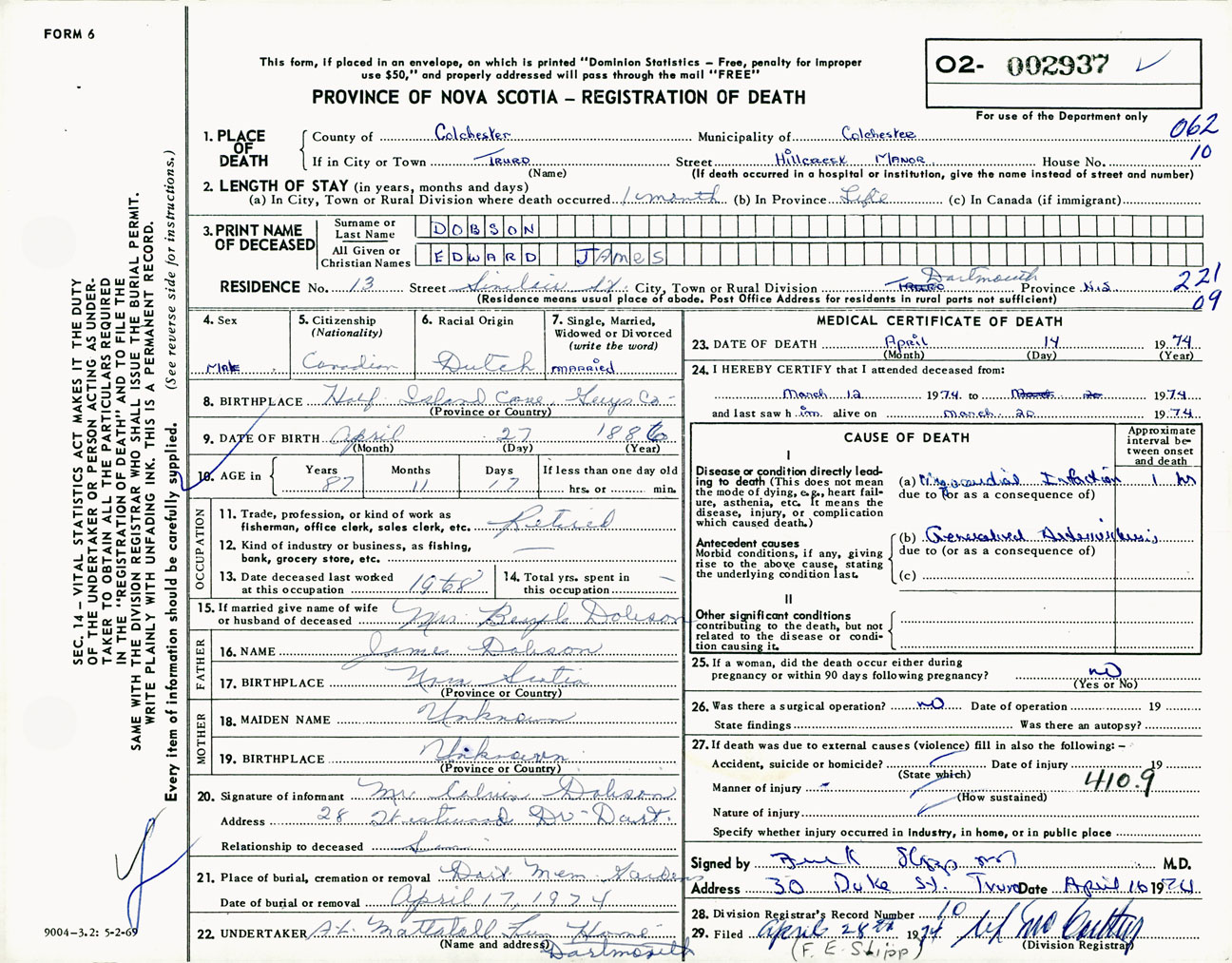 Male Death Registration: Year: 1974 number: 2937