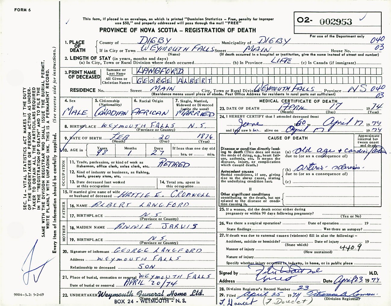 Male Death Registration: Year: 1974 number: 2953