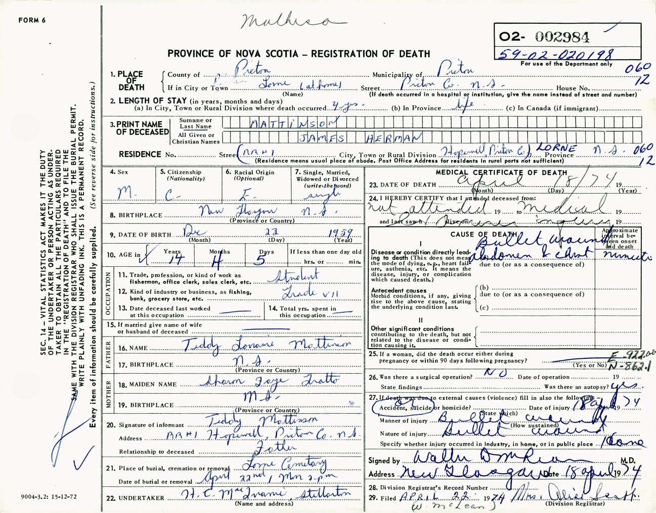 Male Death Registration: Year: 1974 number: 2984