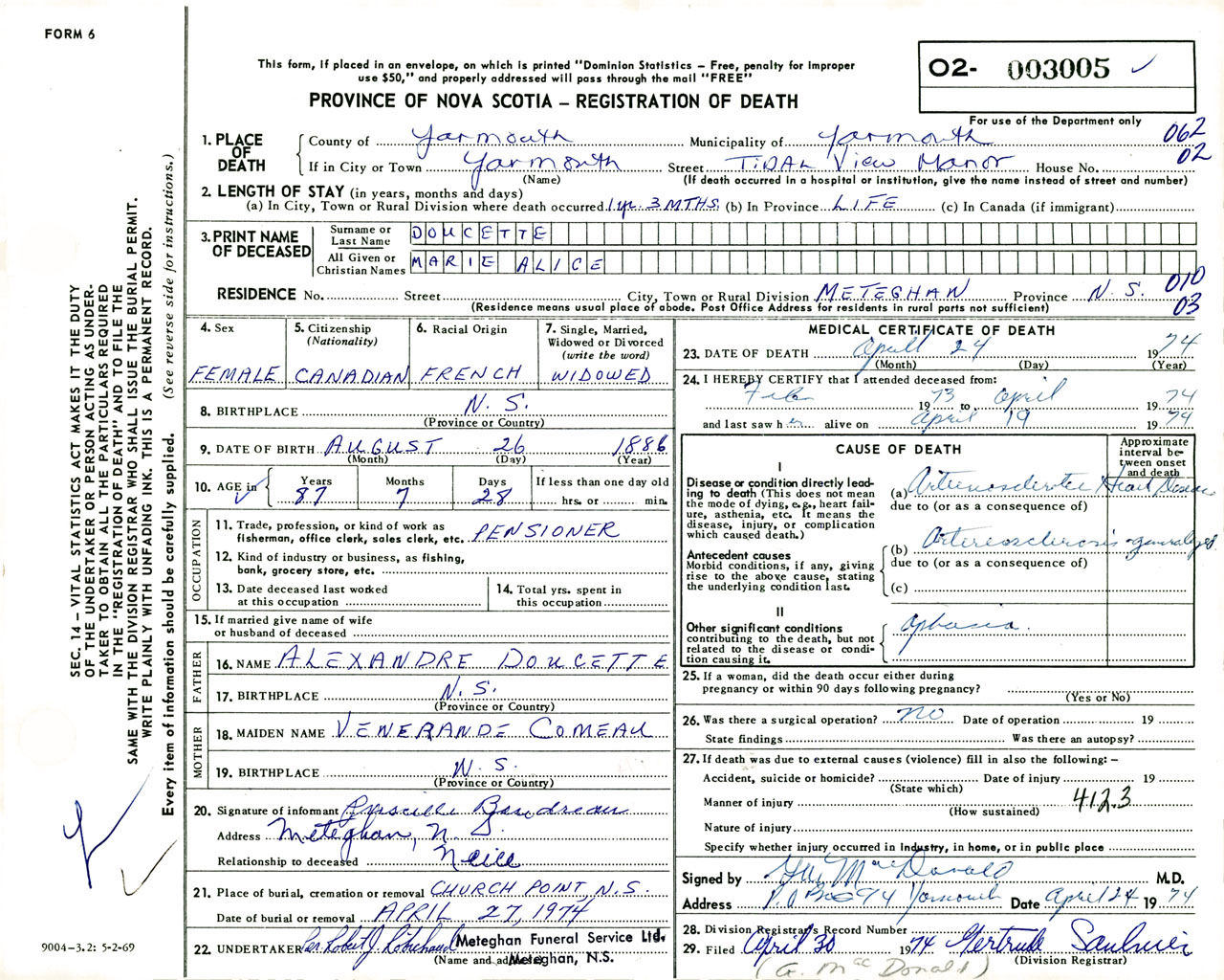 Female Death Registration: Year: 1974 number: 3005