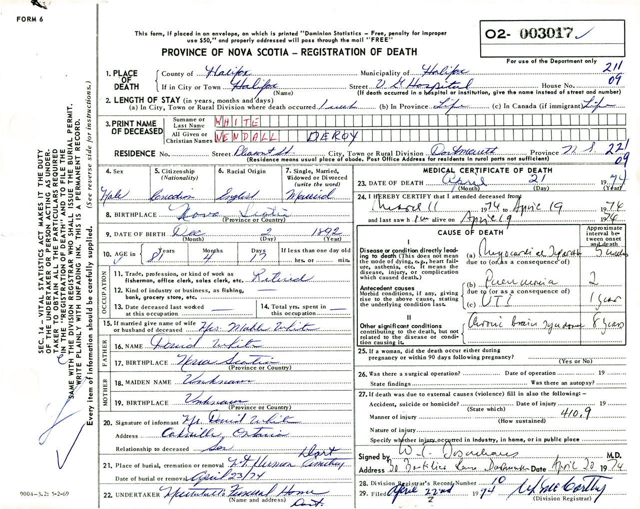 Male Death Registration: Year: 1974 number: 3017