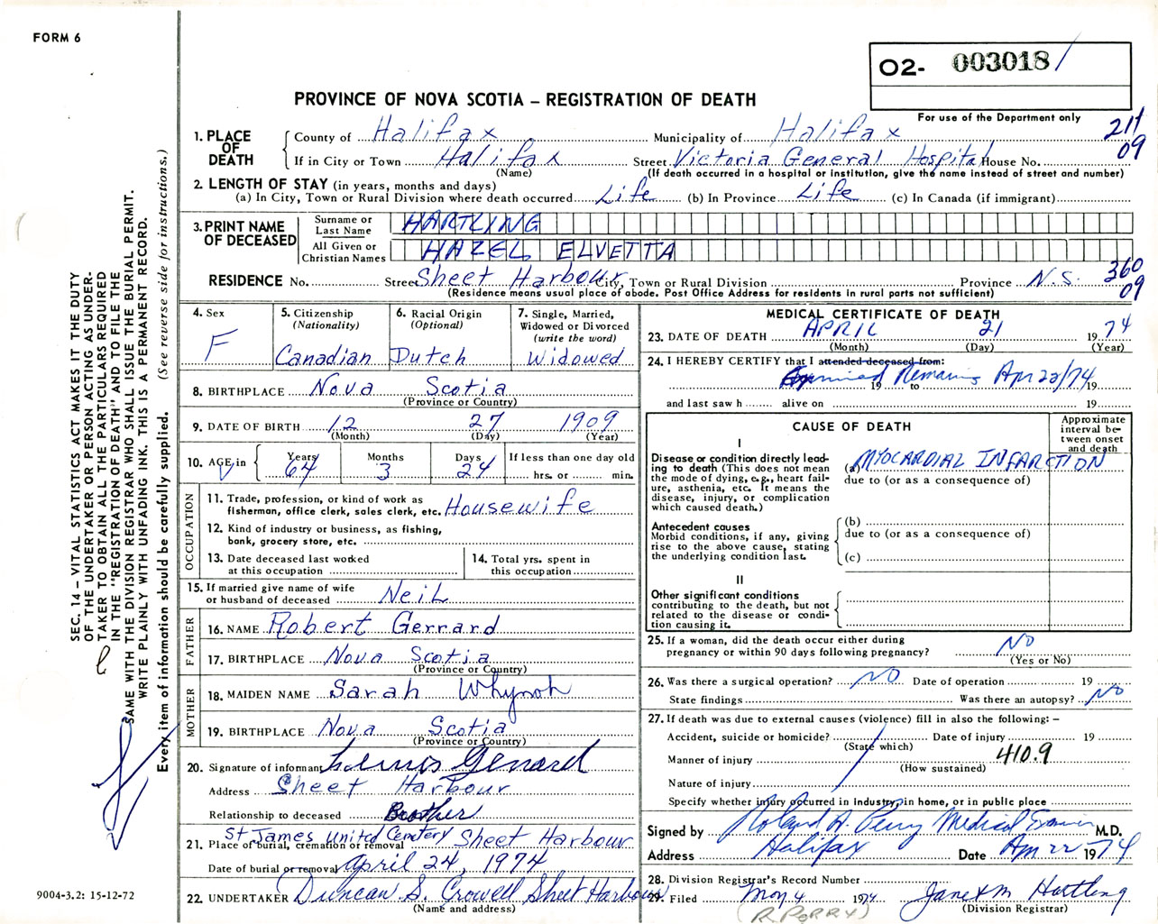 Female Death Registration: Year: 1974 number: 3018