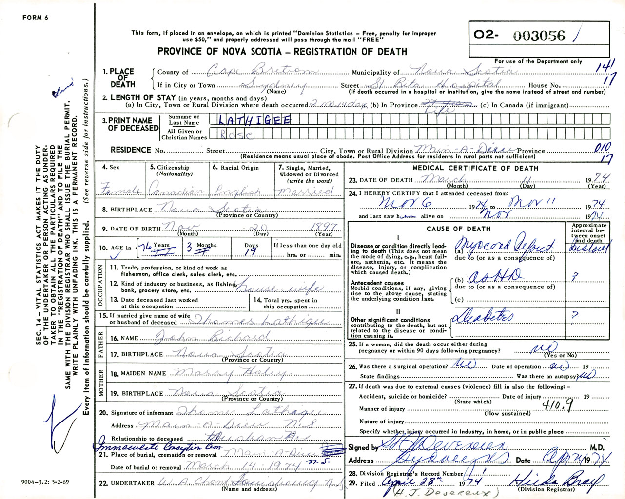 Female Death Registration: Year: 1974 number: 3056