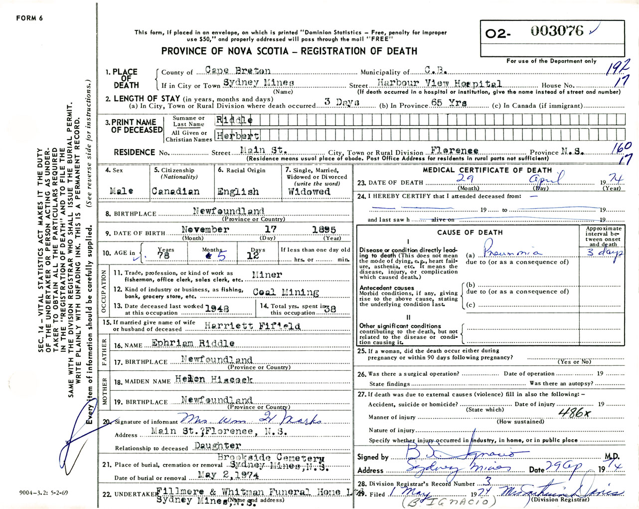 Male Death Registration: Year: 1974 number: 3076