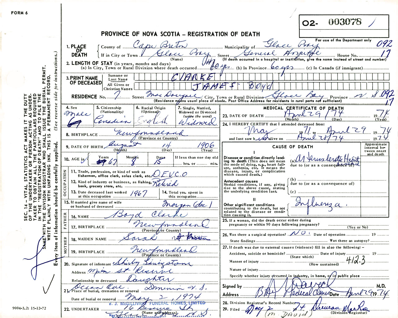 Male Death Registration: Year: 1974 number: 3078