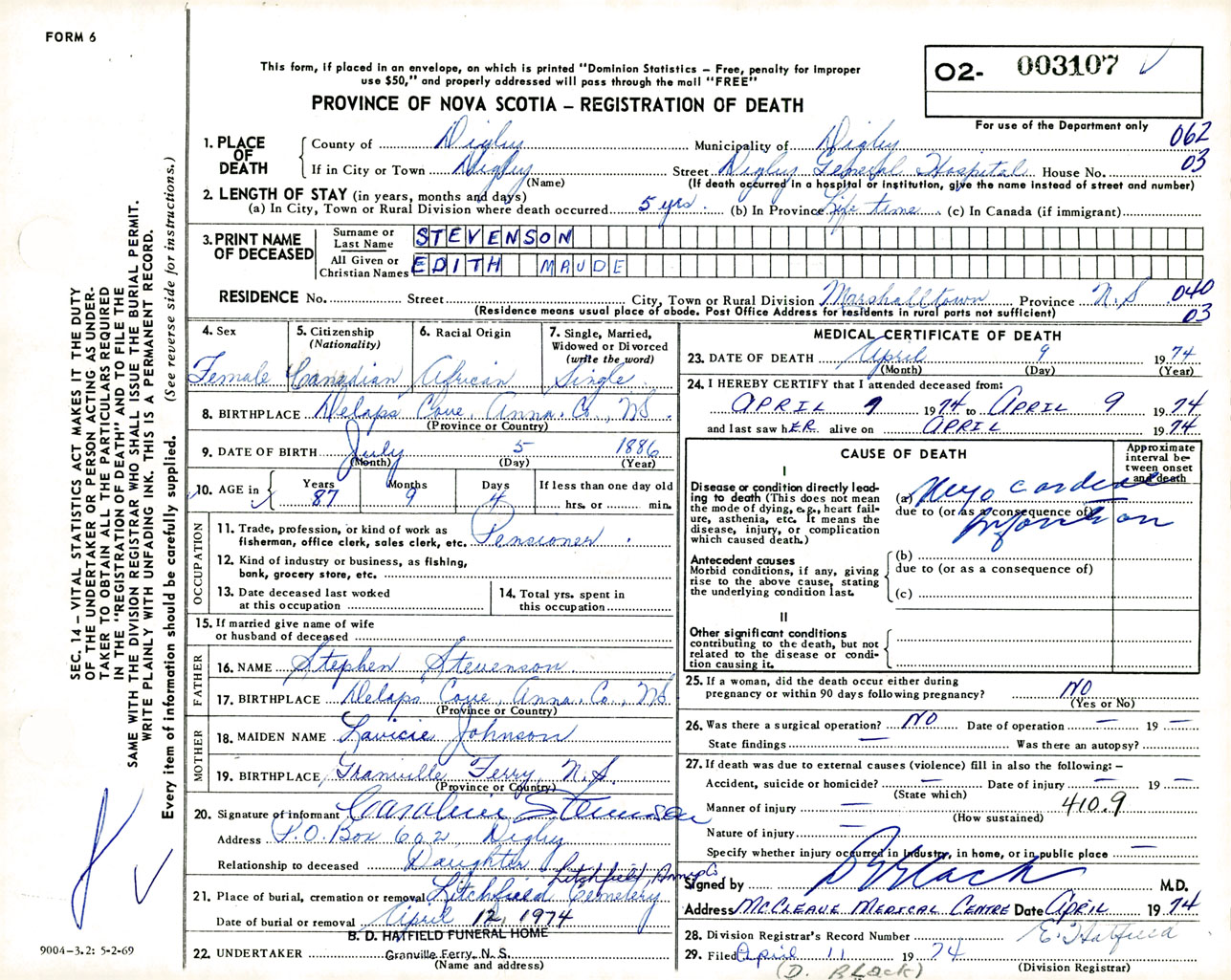 Female Death Registration: Year: 1974 number: 3107