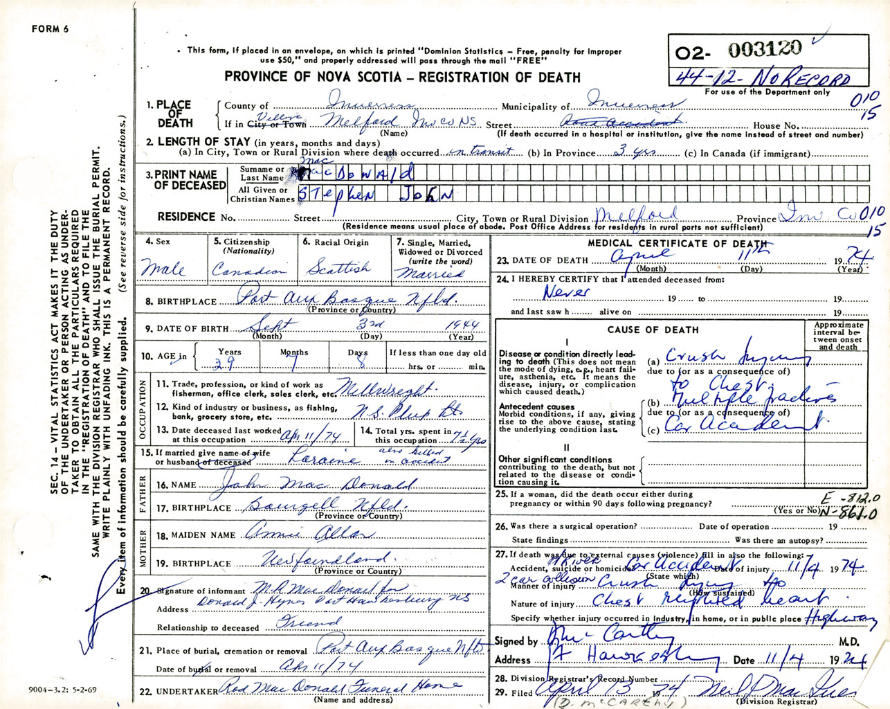 Male Death Registration: Year: 1974 number: 3120