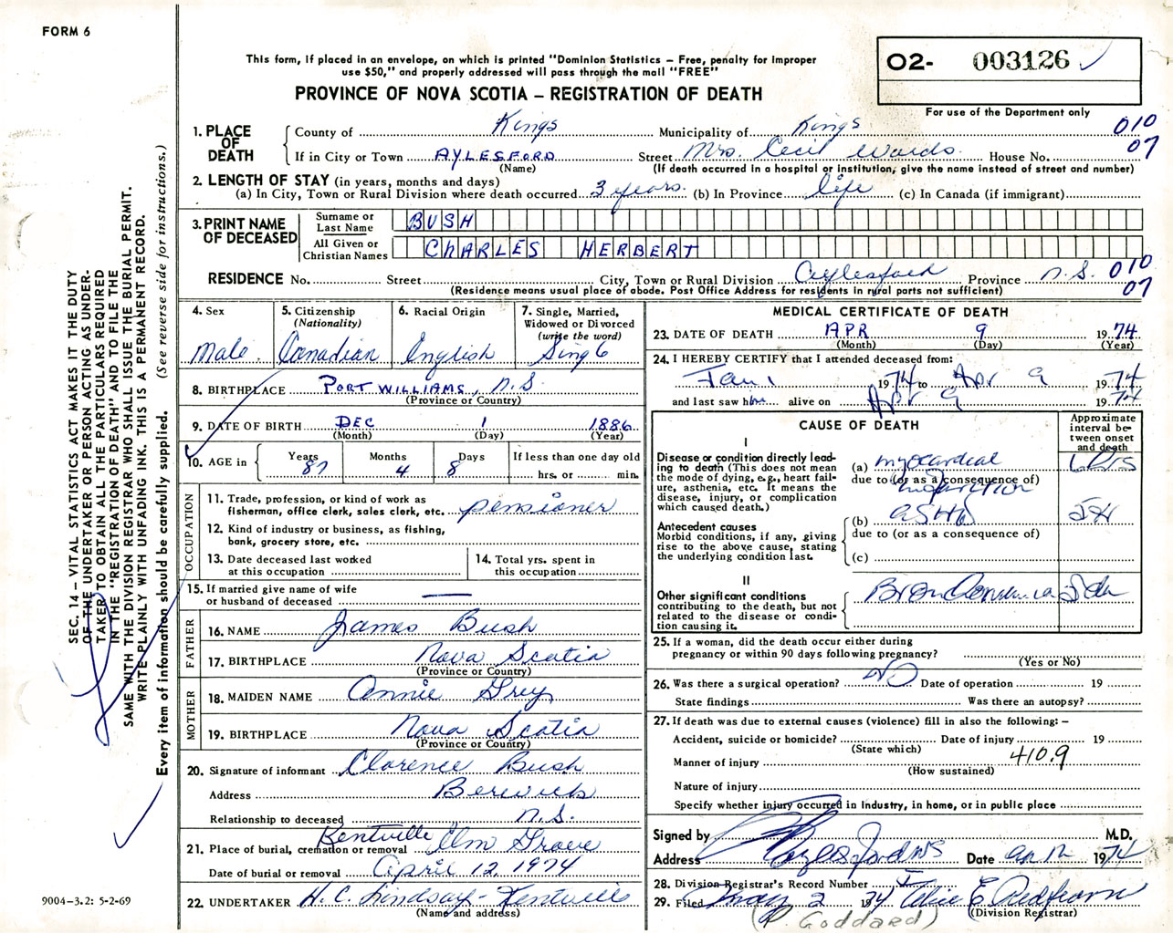 Male Death Registration: Year: 1974 number: 3126