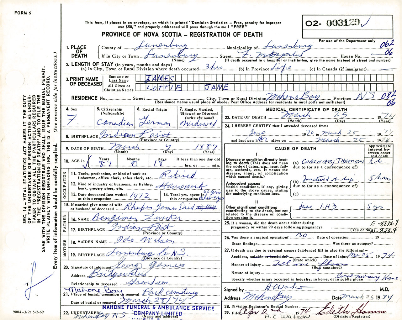 Female Death Registration: Year: 1974 number: 3129
