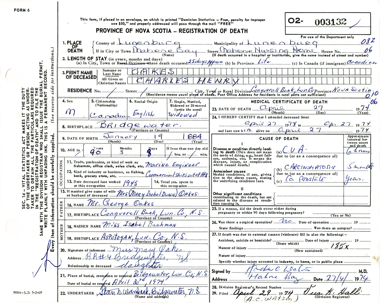 Male Death Registration: Year: 1974 number: 3132