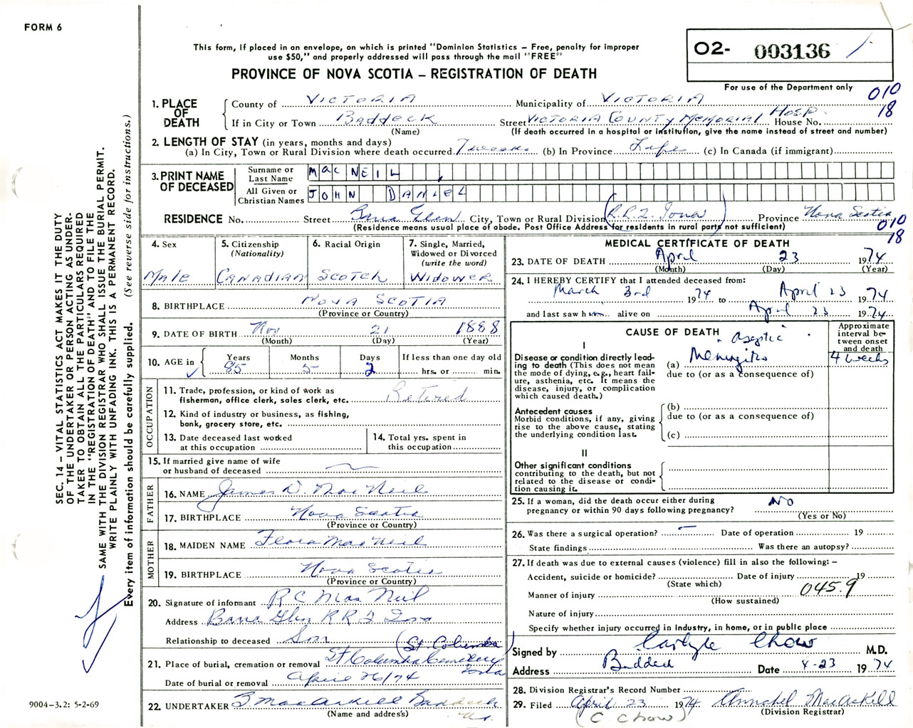 Male Death Registration: Year: 1974 number: 3136