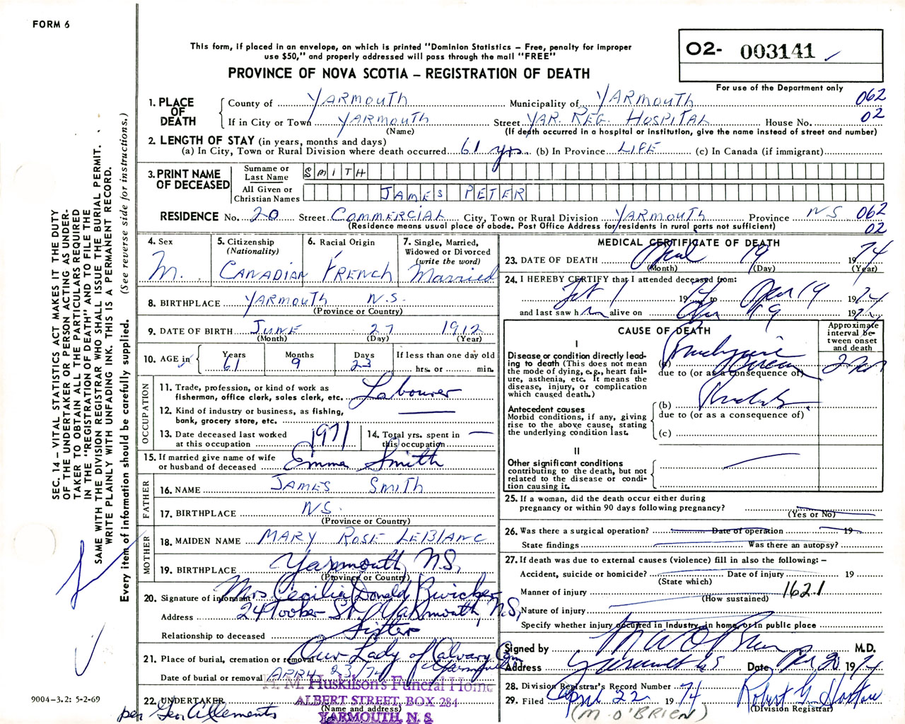 Male Death Registration: Year: 1974 number: 3141