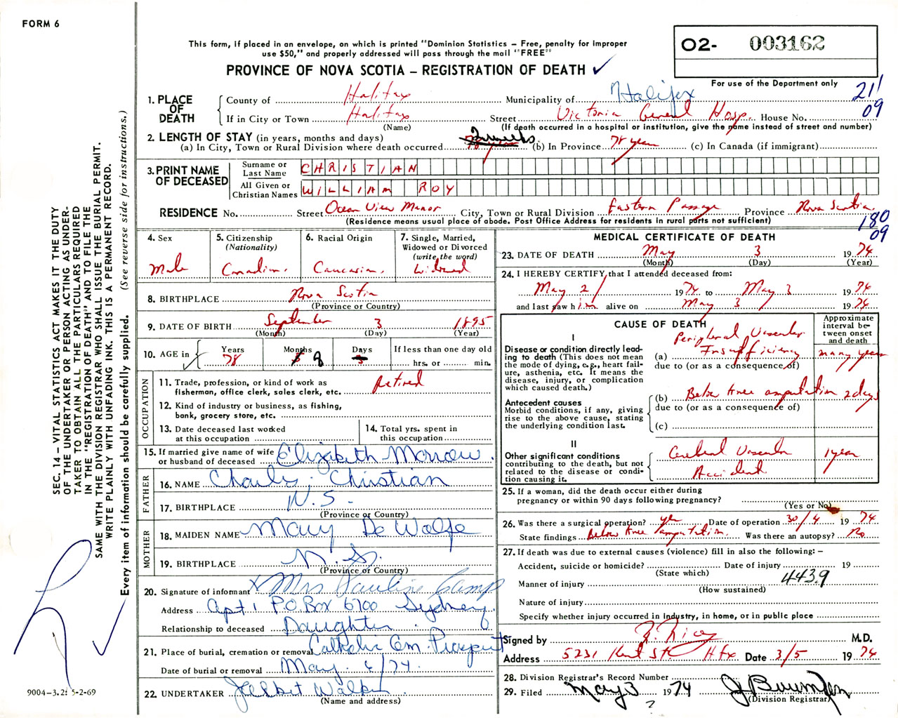 Male Death Registration: Year: 1974 number: 3162