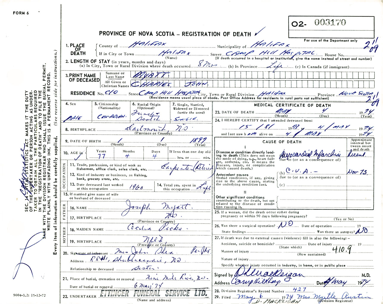 Male Death Registration: Year: 1974 number: 3170