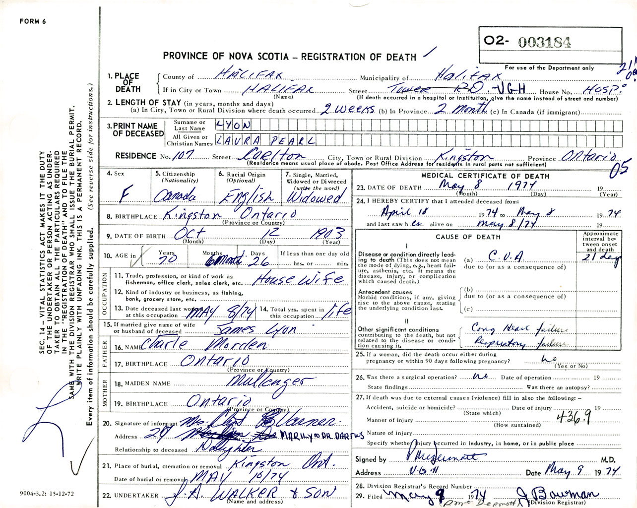 Female Death Registration: Year: 1974 number: 3184