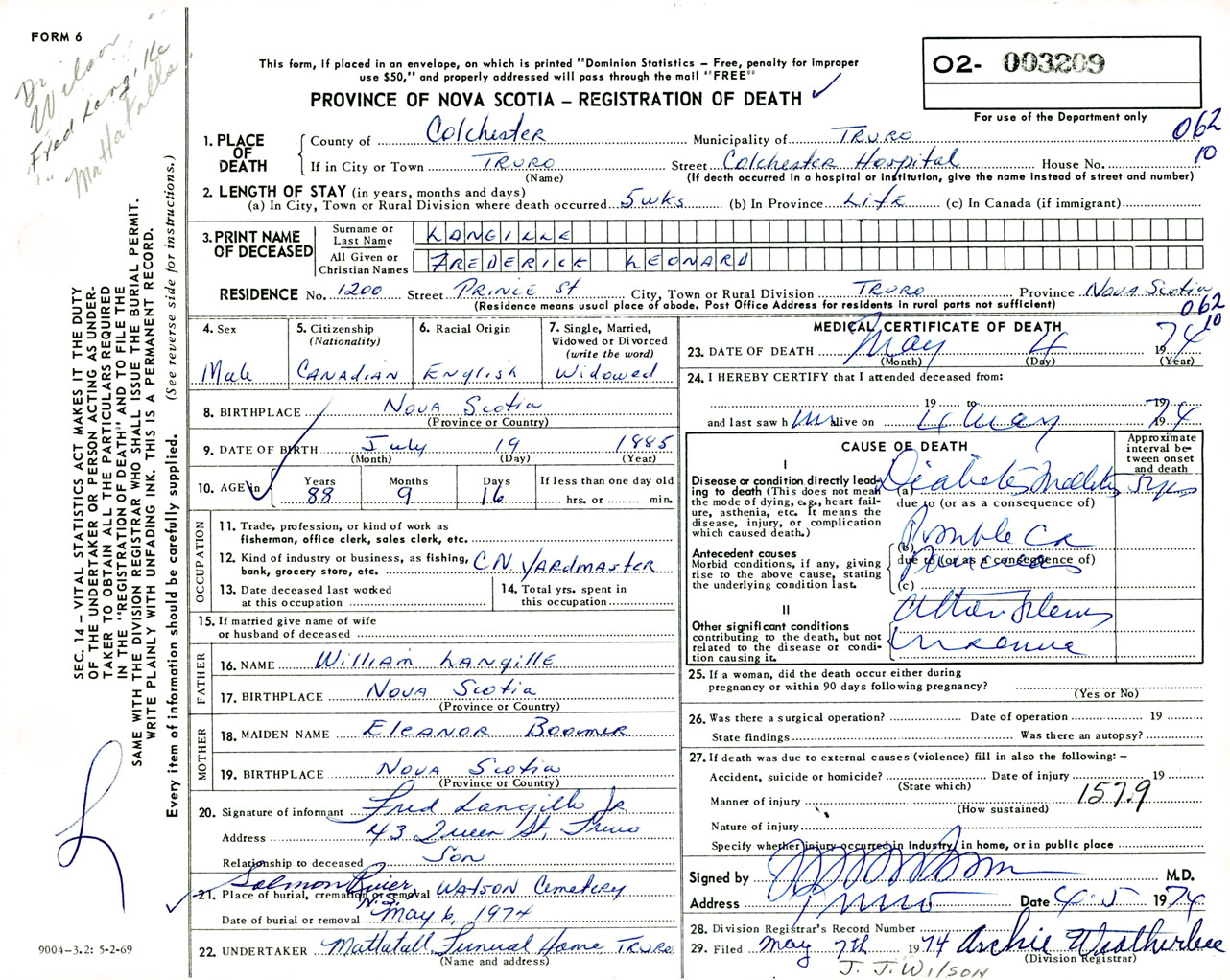 Male Death Registration: Year: 1974 number: 3209