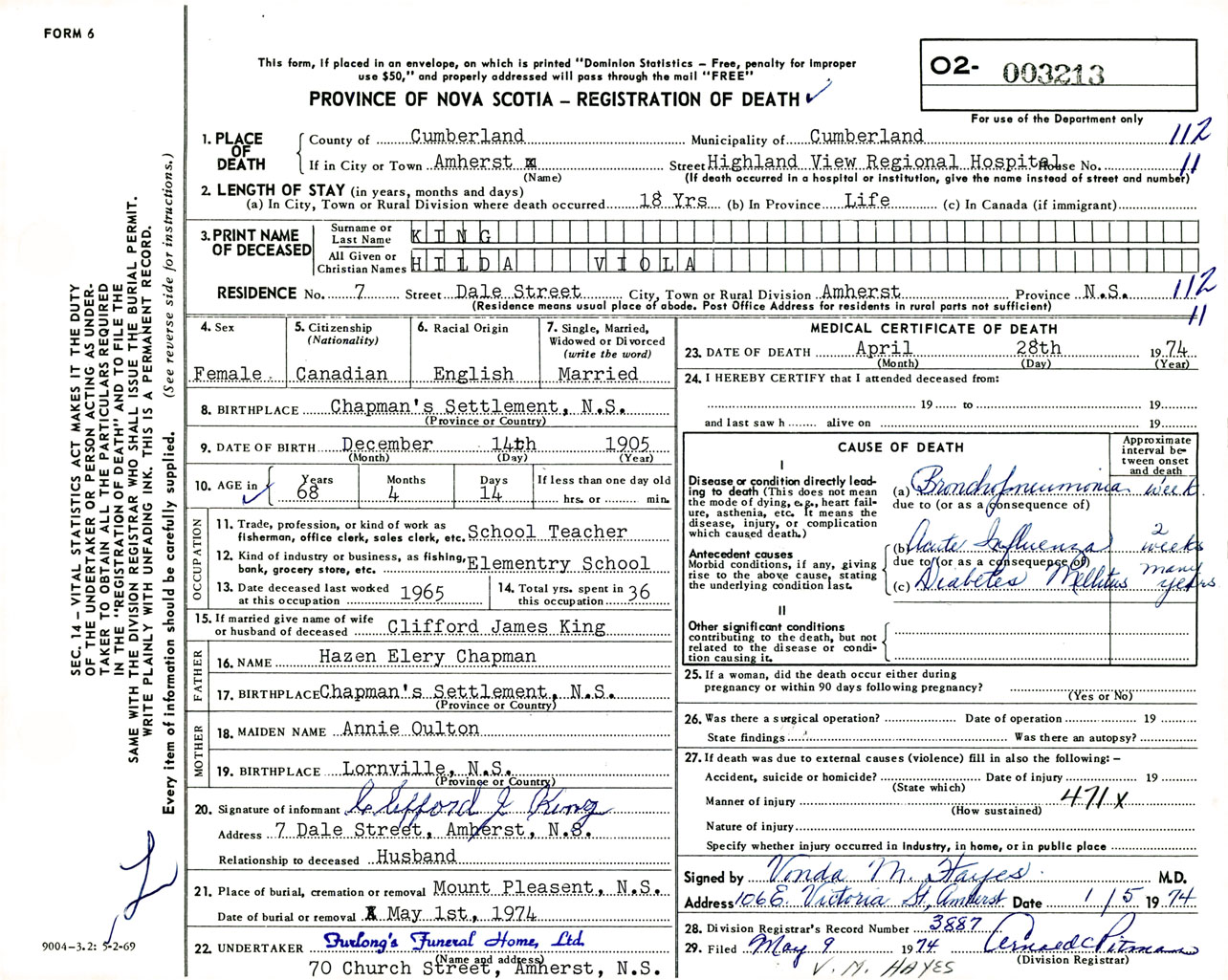 Female Death Registration: Year: 1974 number: 3213